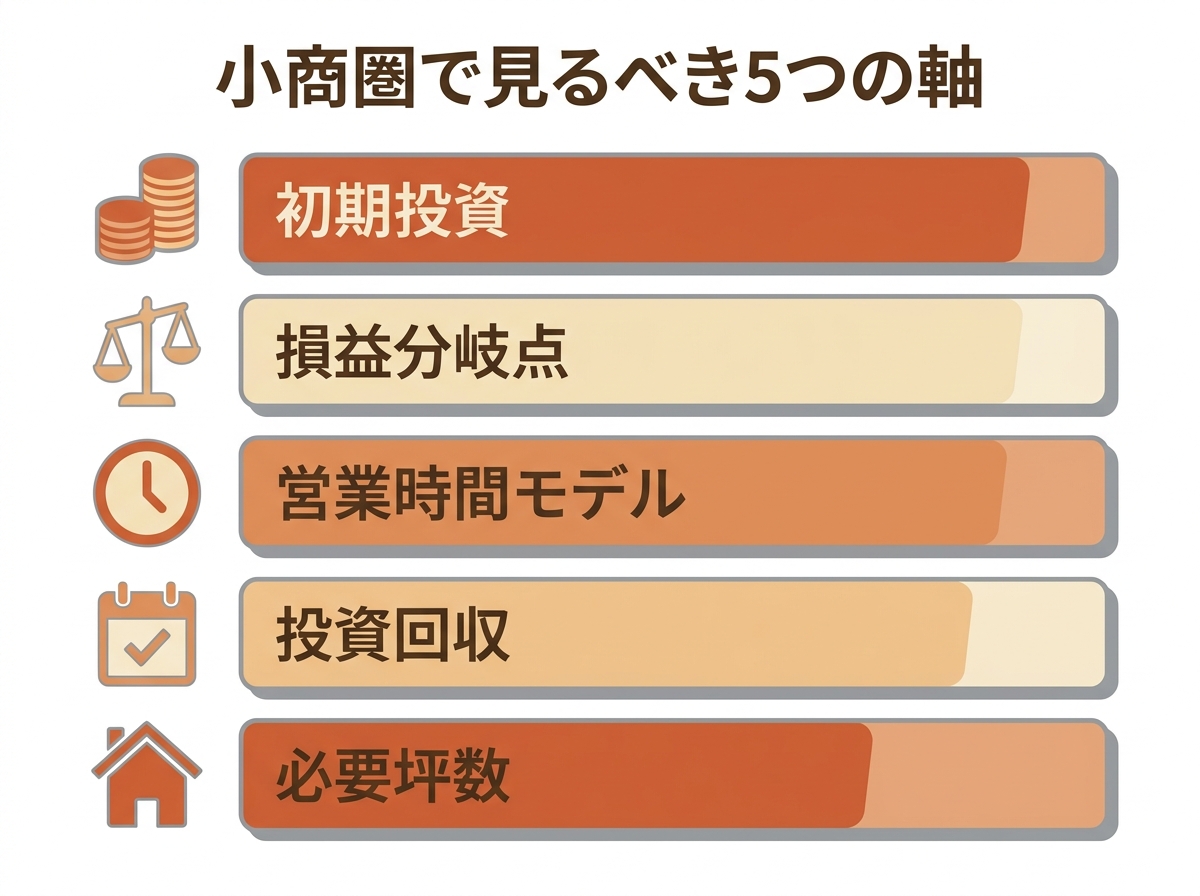 地方・小商圏で本当に成り立つかを判断するには、「どの軸で比べるか」を先に決めておく必要があります。この記事では、検討層のニーズ分析から初期投資、営業時間モデル、投資回収期間、必要坪数、営業利益率、月商実績の6軸を選び、重要度の高い順に並べました。「資金の現実(初期投資・坪数)」と「収益の現実(月商・利益率・回収期間)」と「運営の現実(営業時間)」をこの順で揃えると、宣伝文句ではなく総合評価で比較できます。