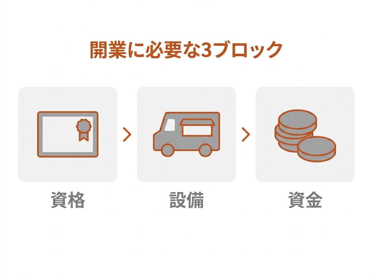 キッチンカー開業に必要なものは、ざっくり分けて資格・設備(車両)・資金の3ブロックです。ここでは2021年6月改正食品衛生法に対応した最新の制度と相場を整理します。