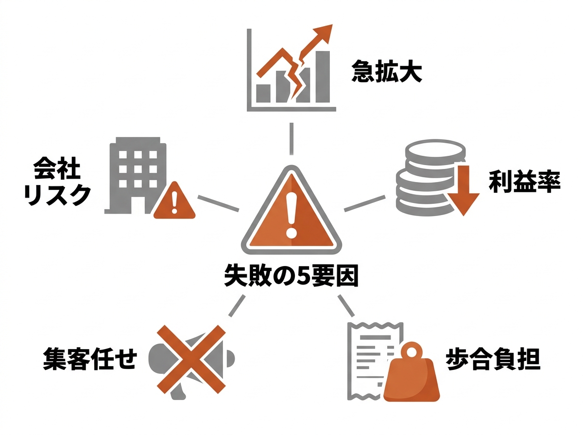 鰻の成瀬の失速を眺めていると「急拡大が悪」と単純化しがちですが、実際には複数の要因が連鎖して赤字・閉店に至ります。下の5つが、うなぎFCの失敗事例で繰り返し現れる構造的な落とし穴です。| 要因 | 現場での現れ方 | 加盟前に見抜くサイン |
