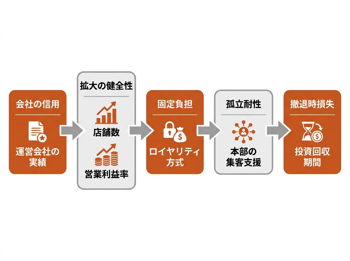 | 歩合ロイヤリティの重さ | 売上が下がっても料率で固定的に本部へ抜かれ、赤字月ほどキャッシュが削られる | 売上歩合のみ、または固定+高歩合の方式。固定額のみの案件との差を確認 |